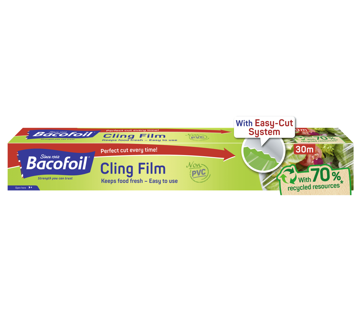 Banish frayed tempers and wasted scrunched-up balls of cling film forever! New Bacofoil® Non-PVC Cling Film not only seals in freshness, keeping food from drying out and preventing the transfer of odours in the fridge, but the easy to handle, ergonomically designed pack has a unique Easy-Cut System which includes a new curved blade to improve the cutting of the film, ensuring a perfect cut every time.