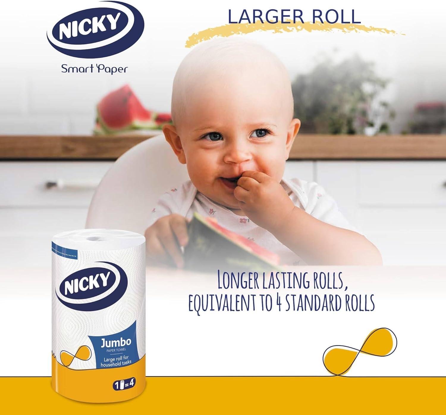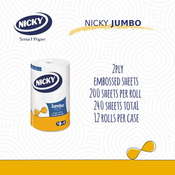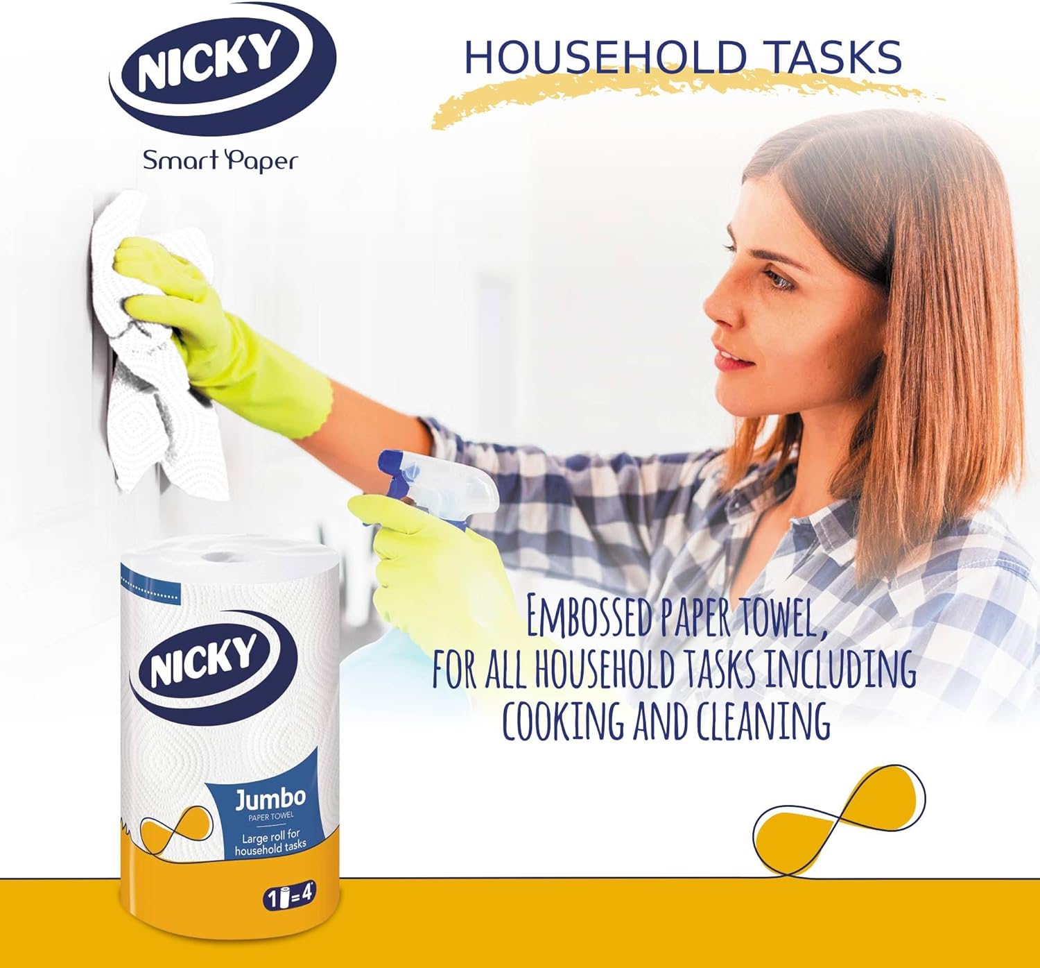 When the going gets tough, reach for Nicky Jumbo kitchen paper towels, your two-ply hero designed for household excellence. Its extra-long length and ultra-absorbency ensure hygiene and cleanliness in every chore, including cooking. Its sophisticated design, available in 4 colours, integrates into any kitchen decor.