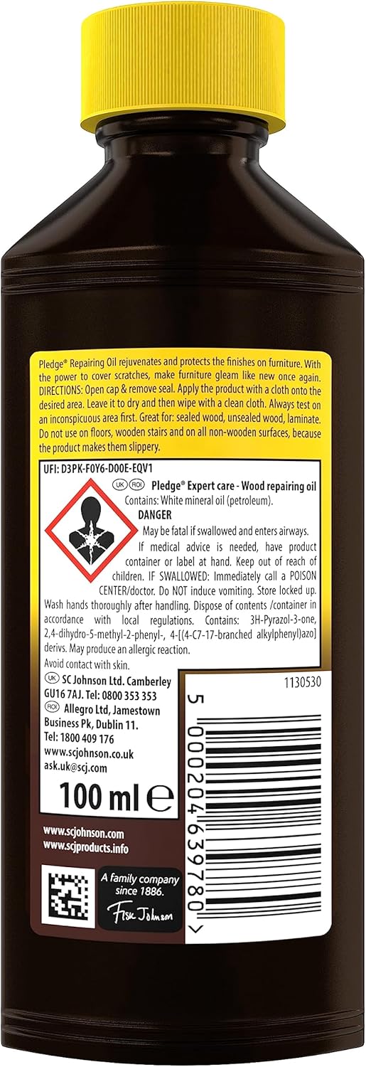 Pledge Expert Care Repairing Oil for Dark Wood is a specialized 100ml treatment designed to restore the beauty of dark-toned wooden furniture and surfaces. This unique oil-based formula goes beyond simple polishing; it works to minimize the appearance of minor scratches, scuffs, and other imperfections by blending them into the wood's finish. The oil simultaneously nourishes the wood, helping to prevent drying and cracking while enhancing its natural deep colour and restoring a rich, lustrous shine. It is intended for targeted application to help preserve and protect valuable dark wood items throughout the home.